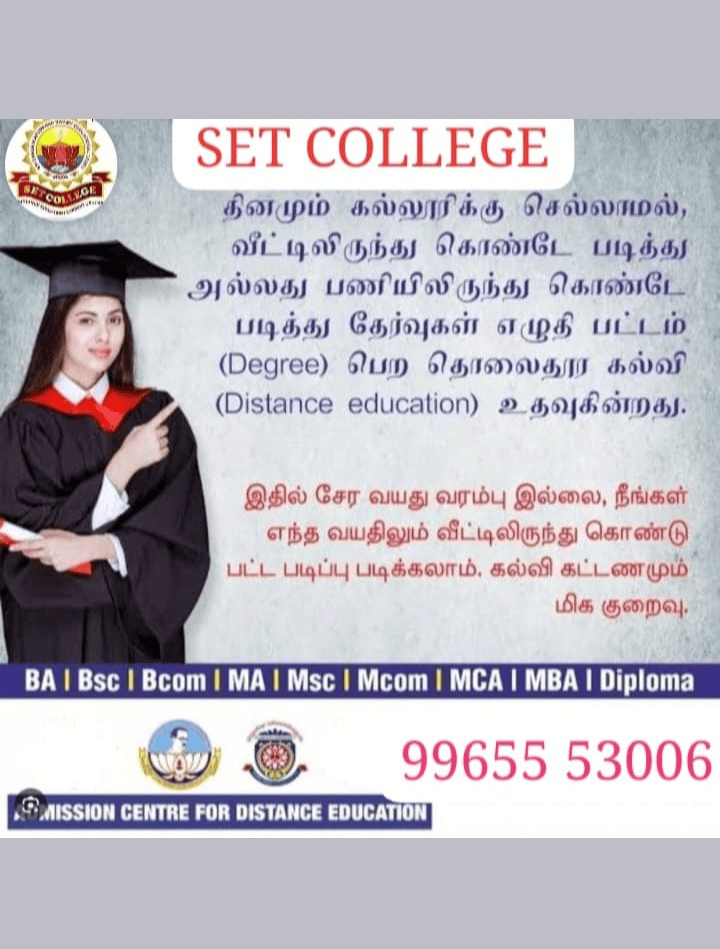 SET College Distance Education Learning Centre has been a trusted name in providing quality education since its establishment in 2005. We take pride in our strong affiliations with some of the most reputed universities in Tamil Nadu, offering a diverse range of Undergraduate (UG) and Postgraduate (PG) programs. Our partner universities include: